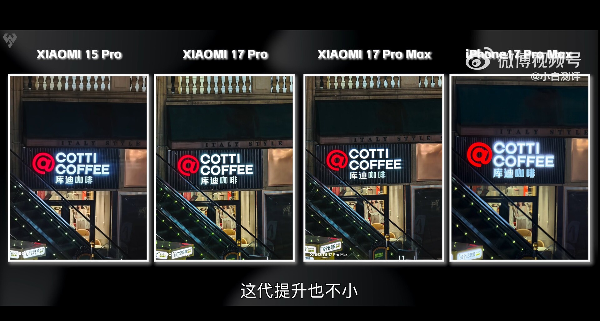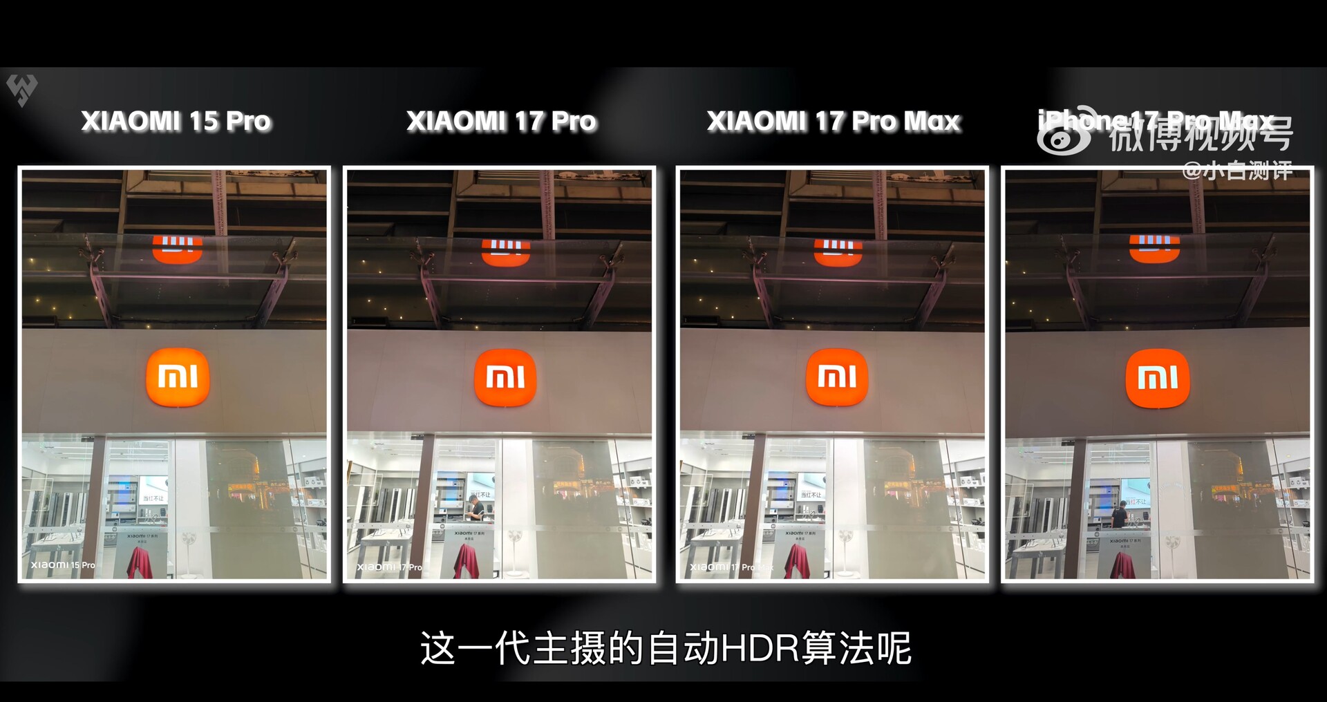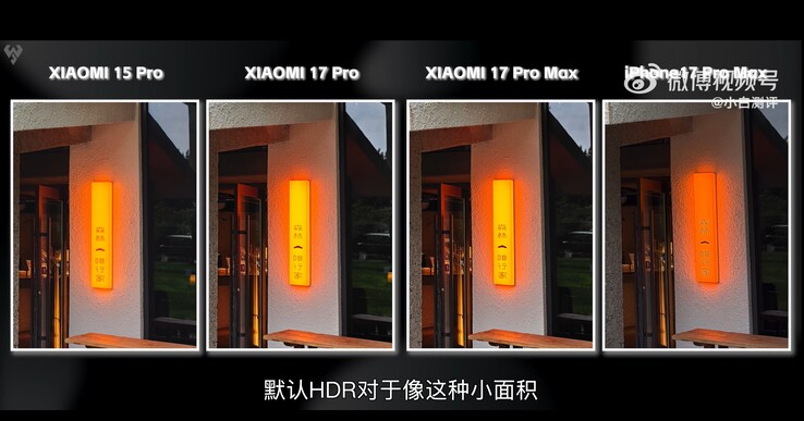 Die folgenden Screenshots stammen aus einem Testvideo eines bekannten Smartphone-Testers in China (Xiaobai Evaluation auf Weibo). In den ersten Beispielen sieht man sehr gut die Vorteile des mit 16,5 Blendenstufen extrem dynamischen neuen Light Hunter 950L Sensors in der 23mm Hauptkamera der beiden aktuellen Leica-Kamera-Flaggschiffe, nicht nur im Vergleich mit der Vorgänger-Generation Xiaomi 15 Pro sondern auch dem etwa gleich großen 1/1.28 Zoll Sensor im iPhone 17 Pro Max (hier bei Amazon erhältlich).