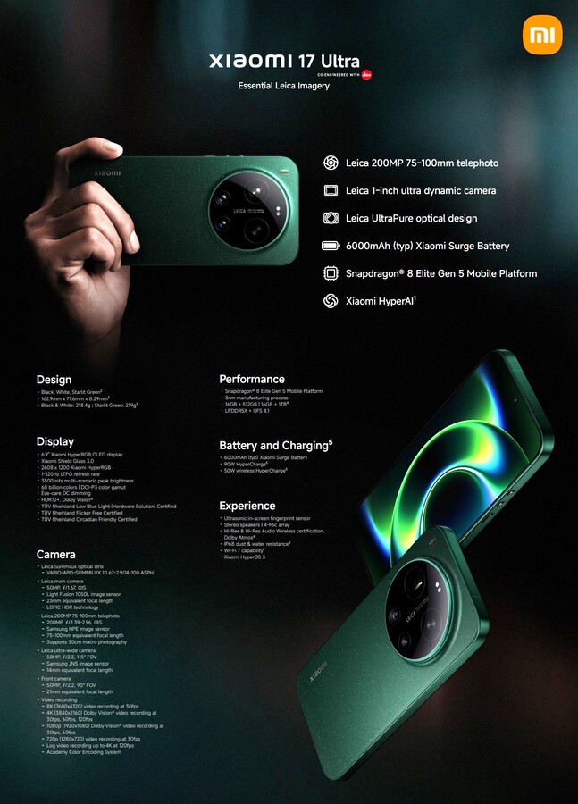 Das Highlight des Xiaomi 17 Ultra ist sicherlich einerseits der dank LOFIC-Technologie extrem dynamische Light Fusion 1050L Sensor im 1-Zoll-Format sowie das 200 Megapixel Telefoto, das dank variablen Brennweiten im Bereich zwischen 75 bis 100 mm äquivalent echte optische Zoomqualität sowie eine Leica APO-Optik bietet. Das Xiaomi 17 Ultra gibt es hierzulande in dern Farben Black, White sowie Starlit Green, dazu passend bietet Xiaomi die Wahl zwischen zwei Kamera-Kits.
