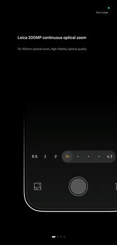 In den Bildern unten ist neben den üblichen Zoompositionen 0,6x, 1x und 2x auch ein Bereich zwischen 3x Zoom und 4,3x Zoom zu erkennen, der also offenbar Brennweiten zwischen 70mm und 100mm abdeckt und von einer weiteren In-Sensor-Zoom-Position bei 8,6x Zoom ergänzt wird. Zudem ist explizit von einem "Leica 200 MP kontinuierlichem, optischem Zoom" und "High-Fidelity optischer Qualität" die Rede, womit Xiaomi zwar keinen größeren Zoombereich abdeckt als beim Xiaomi 15 Ultra, den aber offenbar in höherer Qualität.