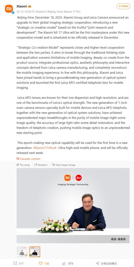 In einem weiteren Weibo-Post haben sich Xiaomi und Leica zudem zu einer tieferen Kooperation bekannt, die auch im Marketing besser sichtbar sein soll. Wie das vermutlich aussehen wird, haben geleakte Wasserzeichen bereits vor einigen Stunden angedeutet, es wird also vermutlich regional unterschiedlich mit den Bezeichnungen "Xiaomi 17 Ultra by Leica" und "Leitzphone powered by Xiaomi" geworben. Es wird aber auch bessere Leica-Qualität für Konsumenten geben und zwar in Form apochromatischer Telefoto-Linsen, die von Leica zertifiziert werden. Damit geht Xiaomi in die gleiche Richtung wie Vivo, die in den X-Serie-Flaggschiffen bereits seit Jahren mit Zeiss-APO-Optik für klarere Photos und Videos mit weniger optischen Artefakten werben. Ebenfalls seitens Xiaomi und Leica bestätigt wird eine neue Generation der 1-Zoll-Hauptkamera, die, kombiniert mit dem optisch aufgewerteten Telefoto vor allem bessere Nachtaufnahmen und eine höhere Dynamik verspricht, so Xiaomi.