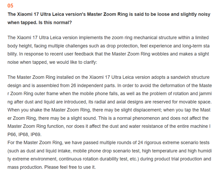 Auf Weibo hat sich Xiaomi in einem längeren Artikel mittlerweile zu diesem und anderen Problemen beziehungsweise Fragen der Community geäußert und bestreitet Produktionsprobleme. Demnach sei der drehbare Teil bewusst locker, um auch nach Stürzen oder bei Kontakt mit Schmutz und Flüssigkeiten noch einen stabilen Betrieb zu garantieren. Geräusche beim Schütteln seien demnach ebenfalls normal. Einen maschinell übersetzten Ausschnitt aus dem Artikel haben wir unten eingebettet. Warum manche der Ringe allerdings nicht wackeln, etwa der des X-Users @Devinarde, erklärt Xiaomi nicht.