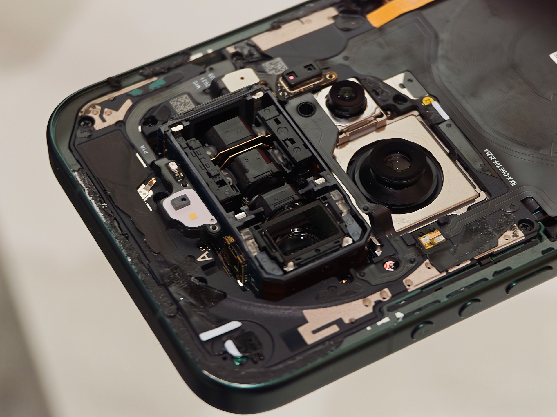 Die zweite große Besonderheit ist das Telemodul: Statt auf mehrere gestaffelte Telekameras zu setzen, verbaut Xiaomi ein 200‑Megapixel‑Periskop mit variablem, mechanischem Aufbau. Im Inneren des Moduls verschieben sich Linsengruppen, um einen kontinuierlichen optischen Zoombereich abzudecken, der ungefähr klassischen 75 bis 100 Millimetern Kleinbild entspricht. Anders als bei vielen Konkurrenten, die zwischen 3x- und 5x‑Tele hart umschalten, lässt sich der Bildausschnitt hier stufenlos gestalten, ohne direkt in digitalen Crop zu verfallen. Im Alltag sorgt das für konsistentere Bildqualität beim Heranzoomen: Zwischen typischen Portraitbrennweiten und einem engeren 100‑mm‑Ausschnitt bleibt der optische Charakter der Bilder ähnlich, anstatt sichtbar zwischen zwei verschiedenen Modulen zu springen. Der Zoombereich ist zwar klein, aber beim Blick ins Innere des Xiaomi-Smartphones wird schnell klar, warum das so ist – es wird viel Raum benötigt.
