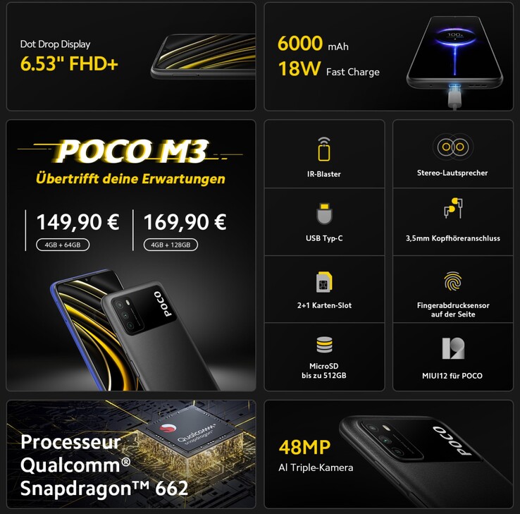 Der Launch des Poco M3 ging wie erwartet über die virtuelle Bühne und brachte bis ganz zum Schluss kaum Überraschungen. Das in Poco Yellow, Cool Blue oder Power Black verfügbare neue Midrange-Phone der Xiaomi-Tochter startet mit Snapdragon 662 und ist nur mit 4 GB RAM zu haben, eventuell eine kleine Einschränkung für alle die viele Apps parallel offen haben wollen.