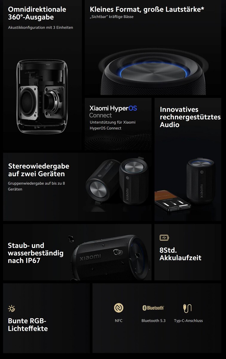 Im Inneren sitzt ein 2.000 mAh Akku für bis zu 11 Stunden Audio ohne bzw. 8 Stunden mit Beleuchtung. Der mit Xiaomi HyperOS kompatible und einfach per NFC mit einem Smartphone koppelbare Bluetooth-Lautsprecher Xiaomi Bluetooth Speaker Mini ist nach IP67 gegen Staub und Wasser geschützt und bietet mit einem Gummisockel an der Unterseite einen sicheren Stand und Schutz gegen Stöße.
