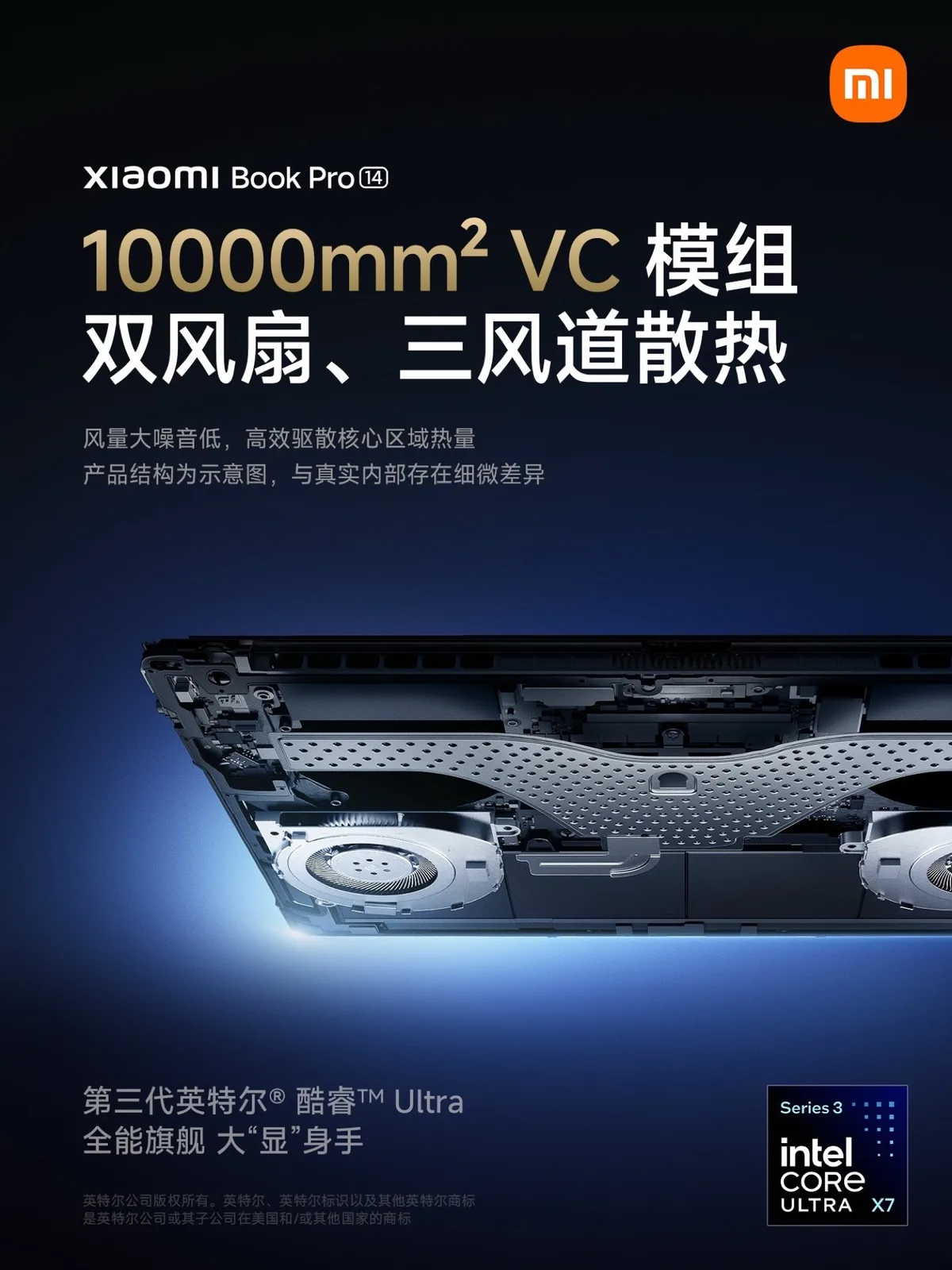 Laut Xiaomi kann der Prozessor selbst im Akku-Betrieb mit einer Verlustleistung von 50 Watt betrieben werden, die von Intel beworbenen 80 Watt erreicht das Xiaomi Book Pro 14 also nicht. Auf einem der Bilder zeigt Xiaomi bereits das Kühlsystem, das eine Dampfkammer mit zwei Lüftern kombiniert, um die beworbenen 50 Watt auch unter Dauerlast kühlen zu können.