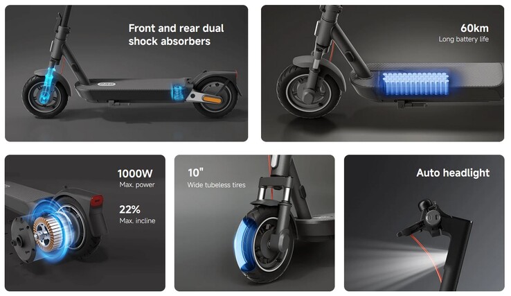 Dies betrifft unter anderem die Reichweite, die mit dem 477 Wh großen Akku nun mit bis zu 60 km etwas größer ausfällt, sich laut Herstellerangaben aber nicht mehr vom vermeintlich günstigeren Electric Scooter 5 unterscheidet. Eine kinetische Energierückgewinnung sorgt für mehr Strecke pro Akkuladung. Unterschiedlich fällt die Motorleistung aus, die beim Pro-Modell bei bis zu 1.000 W liegt. Damit kann der Roller Steigungen bis 22 Prozent bewältigen.