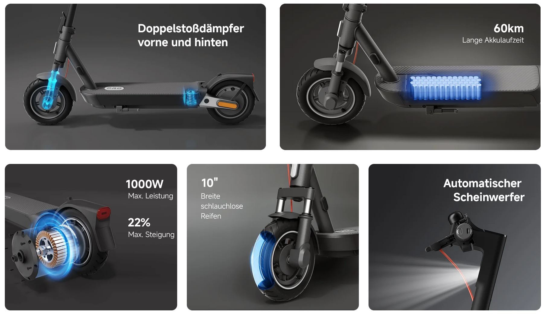 Gefahren wird auf 10 Zoll Schlauchlos-Reifen, während Doppelstoßdämpfer vorne und hinten für Komfort sorgen. Zudem verbaut Xiaomi am robusten Rahmen aus Karbonstahl unter anderem ein duales Bremssystem mit Trommelbremse vorne und E-ABS hinten, ein verbessertes Traktionskontrollsystem (TCS), ein multifunktionales Armaturenbrett sowie eine automatische Beleuchtung samt Blinkern.