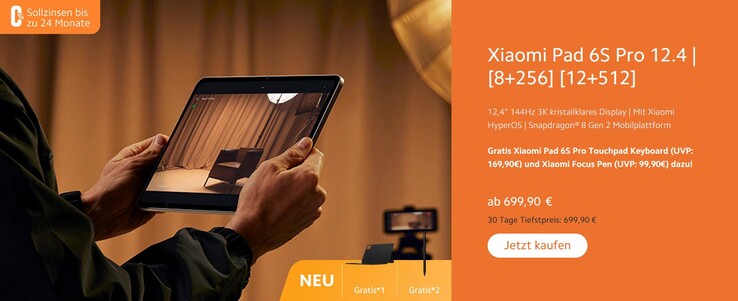Im Rahmen der Aktion ist unter anderem das neue Xiaomi Pad 6S Pro 12.4 vorbestellbar. Xiaomi hatte das Tablet auf dem globalen Launchevent für das Xiaomi 14 vorgestellt, es war bisher aber noch nicht erhältlich. Das ändert sich nun. Das 12,4 Zoll große Premium-Tablet von Xiaomi kostet laut unverbindlicher Preisempfehlung ab 699,90 Euro. Eine Preissenkung gibt es zum Verkaufsstart hier nicht, der Hersteller legt aber zumindest zwei Geschenke in Form des Xiaomi Pad 6S Pro Touchpad Keyboard (UVP 169,90 Euro) und dem Xiaomi Focus Pen (UVP 99,90 Euro) bei.