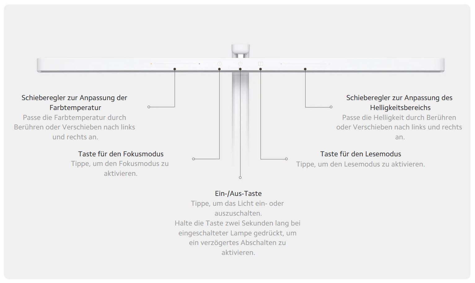 Helligkeit und Farbtemperatur der Xiaomi Led Desk Lamp 2 lassen sich über berührungsempfindliche Tasten am Lampenkopf einstellen. Außerdem kann die smarte Schreibtischlampe von Xiaomi mit den Sprachassistenten Amazon Alexa und Google Assistant vernetzt werden, um die Beleuchtung auch per Sprache zu steuern.
