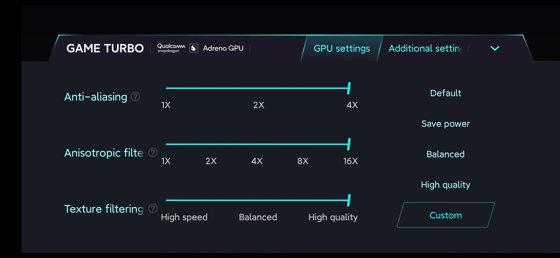 Hierbei handelt es sich um ein neues Feature, das Xiaomi und Qualcomm zusammen entwickelt haben und bisher noch nicht offiziell enthüllt wurde. Game Turbo soll die Möglichkeit bieten, die GPU eines Smartphones in verschiedene Modi zu versetzen sowie Parameter zu verändern. So können Nutzer die Performance der Grafikeinheit beeinflussen, wie man es bereits seit Jahren von Computern und ihren Grafikkarten kennt. Unter anderem soll sich die Taktrate der GPU ändern lassen, um z. B. mehr Leistung herauszukitzeln oder einen energiesparsameren Betrieb zu aktivieren.