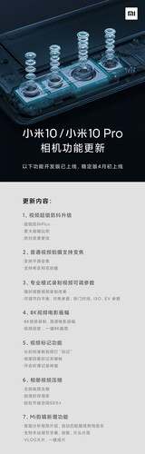 Unter anderem bringt das Mi 10-Update das Feature "Super Stabilizer Plus" mit besserem "Anti-Shake-Effekt", eine Zoom-Unterstützung für normale Videoaufnahmen, einstellbare Parameter für die Videoaufnahme im Professional-Modus inklusive einstellbarem Weißabgleich, Fokusparameter, Verschlusszeit, ISO, EV-Parameter sowie Unterstützung von 8K-Videos (Aufnahme/Wiedergabe).