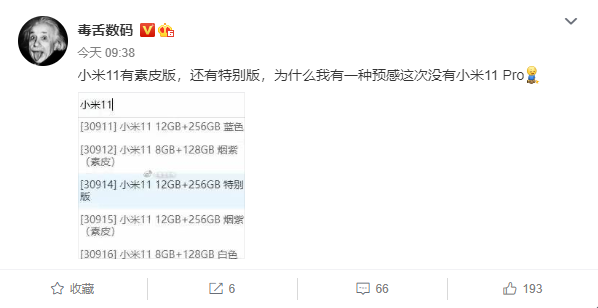Im chinesischen Netzwerk Weibo hat ein bekannte Blogger auch schon die Farb- und Speichervarianten zum Mi 11 entdeckt, die gelten aber natürlich erstmal nur für den China-Launch. Aktuell sind dort offenbar fünf Versionen mit 8 GB oder 12 GB RAM sowie 128 GB oder 256 GB Speicher geplant. Die 8 GB-Version dürfte in weiß und einer violetten (Smoke Purple) Leder-Variante erscheinen, das 12 GB Modell in Blau, violett und einer nicht näher spezifizierten Special Edition. Zum Mi 11 Pro ist aktuell noch nicht viel bekannt, es dürfte auch noch nicht am 28. Dezember vorgestellt werden, schreibt zumindest die chinesische Webseite Mydrivers.