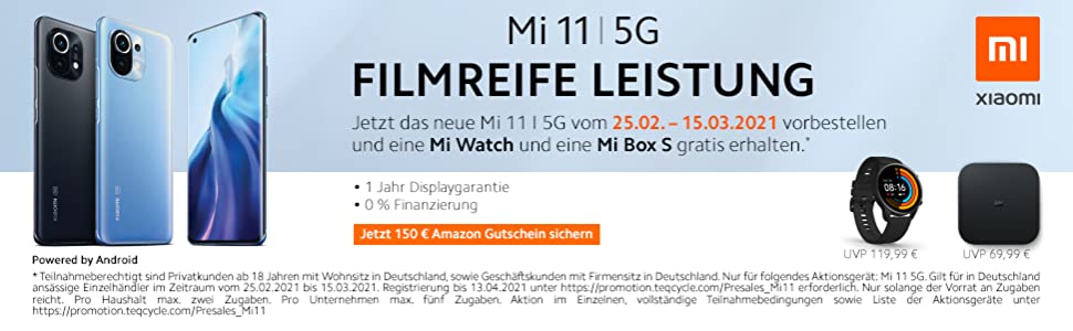 Gestern Abend haben wir berichtet, dass Xiaomi ein tolles Pre-Sale-Angebot für das neue Xiaomi Mi 11 schnürt. Wer das Gerät bei mi.com sowie teilnehmenden Händlern vorbestellt, bekommt die Smartwatch Mi Watch sowie die Streaming-Box Mi Box S mit Android TV gratis dazu.