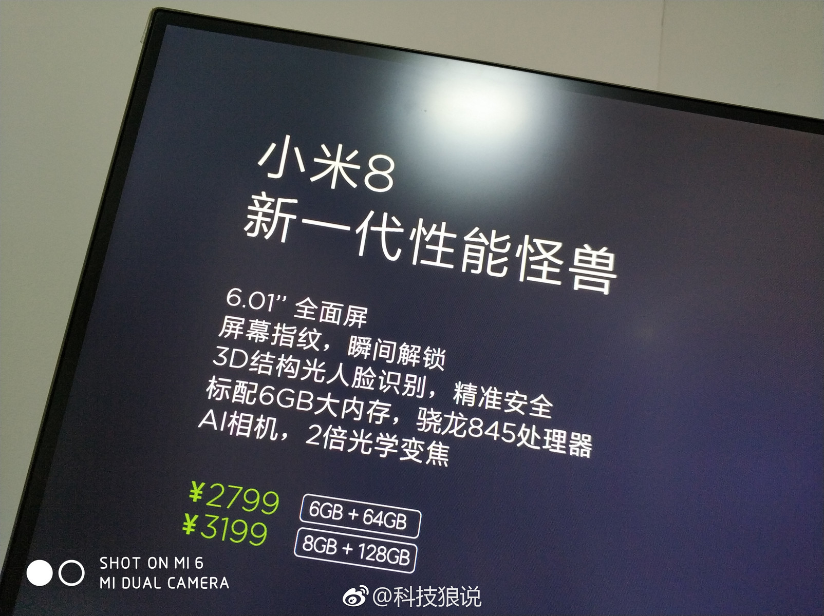 Auf Weibo machen bereits seit Wochen immer wieder neue Leaks zum finalen Design, den Preisen und den endgültigen Spezifikationen zu Xiaomis Mi 8 die Runde. Jetzt sind weitere Informationen aufgetaucht, welche die angeblich avisierten Preise für das Xiaomi Mi 8 nennen. Laut dem Foto-Leak verfügt das Mi 8 über ein 6,01-Zoll-Display mit Fingerabdrucksensor unter dem Display und Qualcomm Snapdragon 845 SoC. Das Modell Mi 8 mit 6 GB RAM und 64 GB Systemspeicher soll rund 2.800 Yuan (373 Euro) kosten, die Ausführung mit 8/128 GB hingegen 3.200 Yuan (425 Euro). Außerdem werden auf dem Foto für das Mi 8 eine AI-Kamera mit 2-facher optischer Zoomunterstützung und ein 3D-Scan-Modul für Gesichtserkennung genannt.