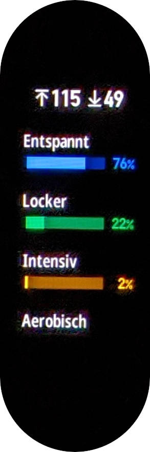 Für ein gezieltes Workout stehen elf Sportarten zur Wahl, darunter auch Schwimmen und Yoga. Das Band zählt die verbrauchten Kalorien und je nach Sportart individuelle Parameter wie bei der Rudermaschine die Schlagzahl pro Minute. In den Einstellungen findet sich die Möglichkeit, einem verbundenen Gerät zu erlauben, die Pulsdaten vom Tracker abzurufen. Was fehlt, ist die Möglichkeit, vor dem Workout eine Zielvorgabe für Zeit oder Kalorienverbrauch zu definieren.