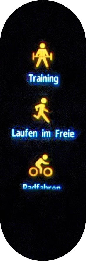 Bis zu 10 informative Kacheln erreicht man nacheinander, wenn man horizontal über den Tracker streicht. In vertikaler Richtung streicht man durch das App-Menü mit weiteren Funktionen. Über die Sensortaste kommt man auf Menüebene jeweils wieder eine Ebene zurück. Die Auswahl der angezeigten Apps und Kacheln erfolgt über die Smartphone-App.