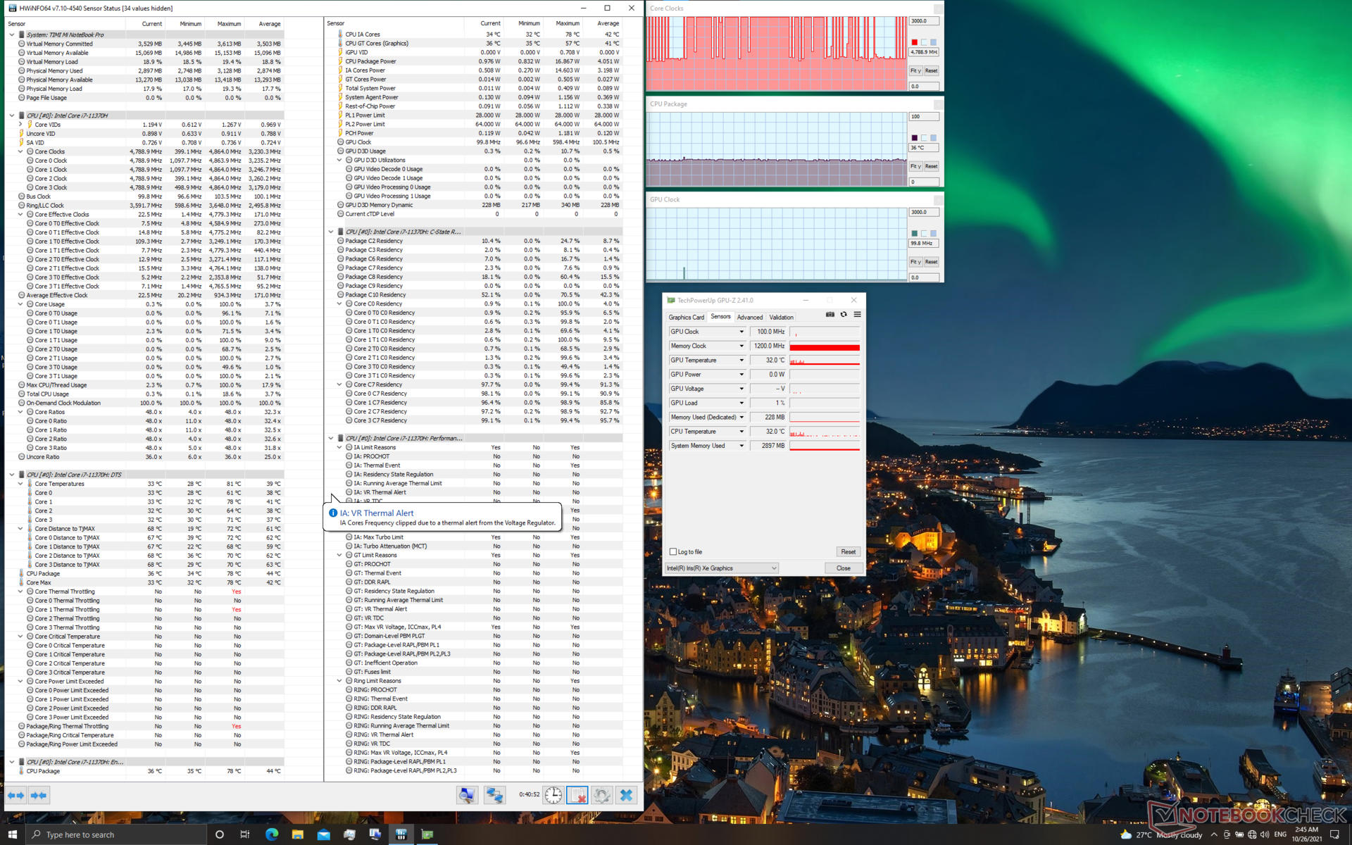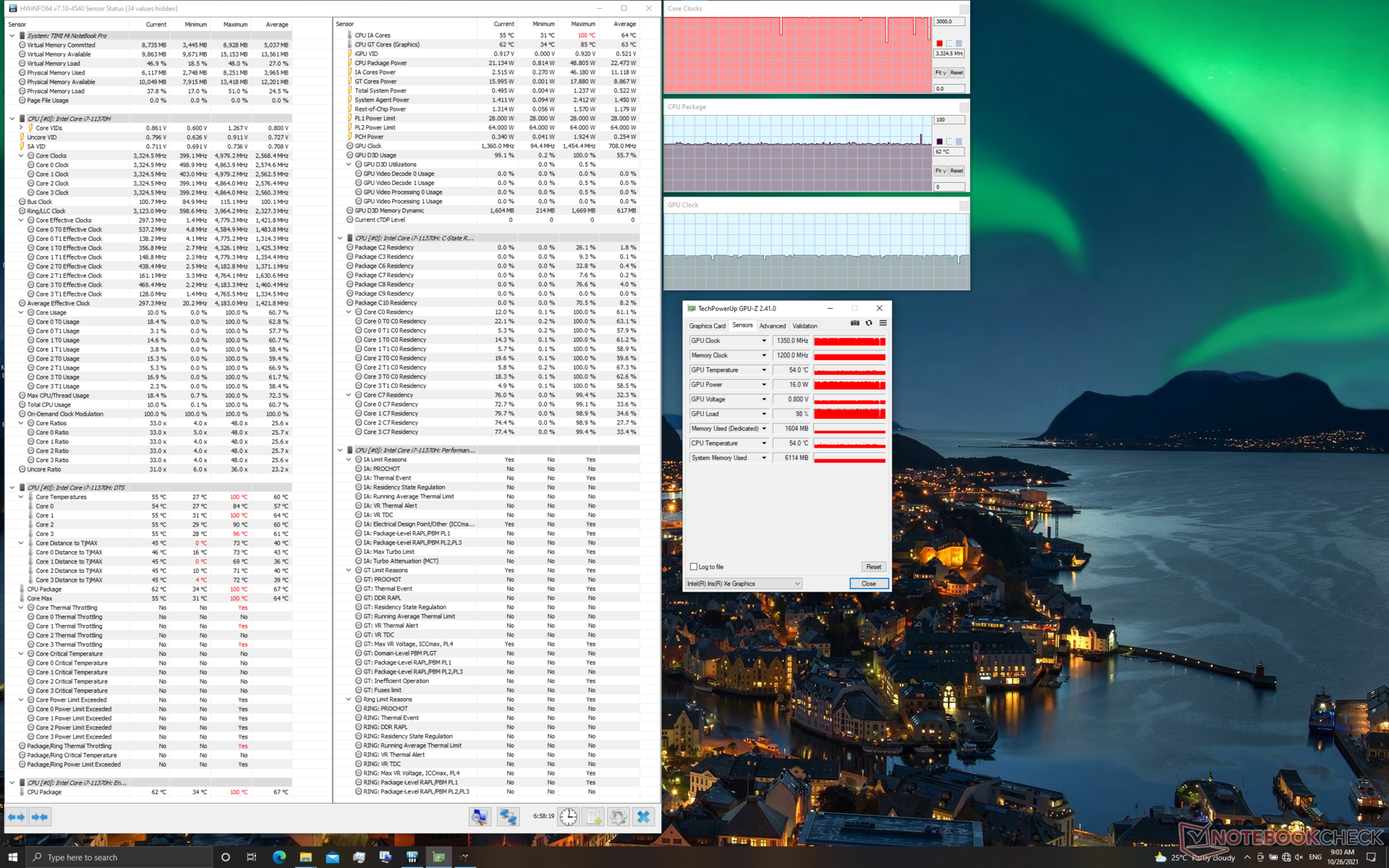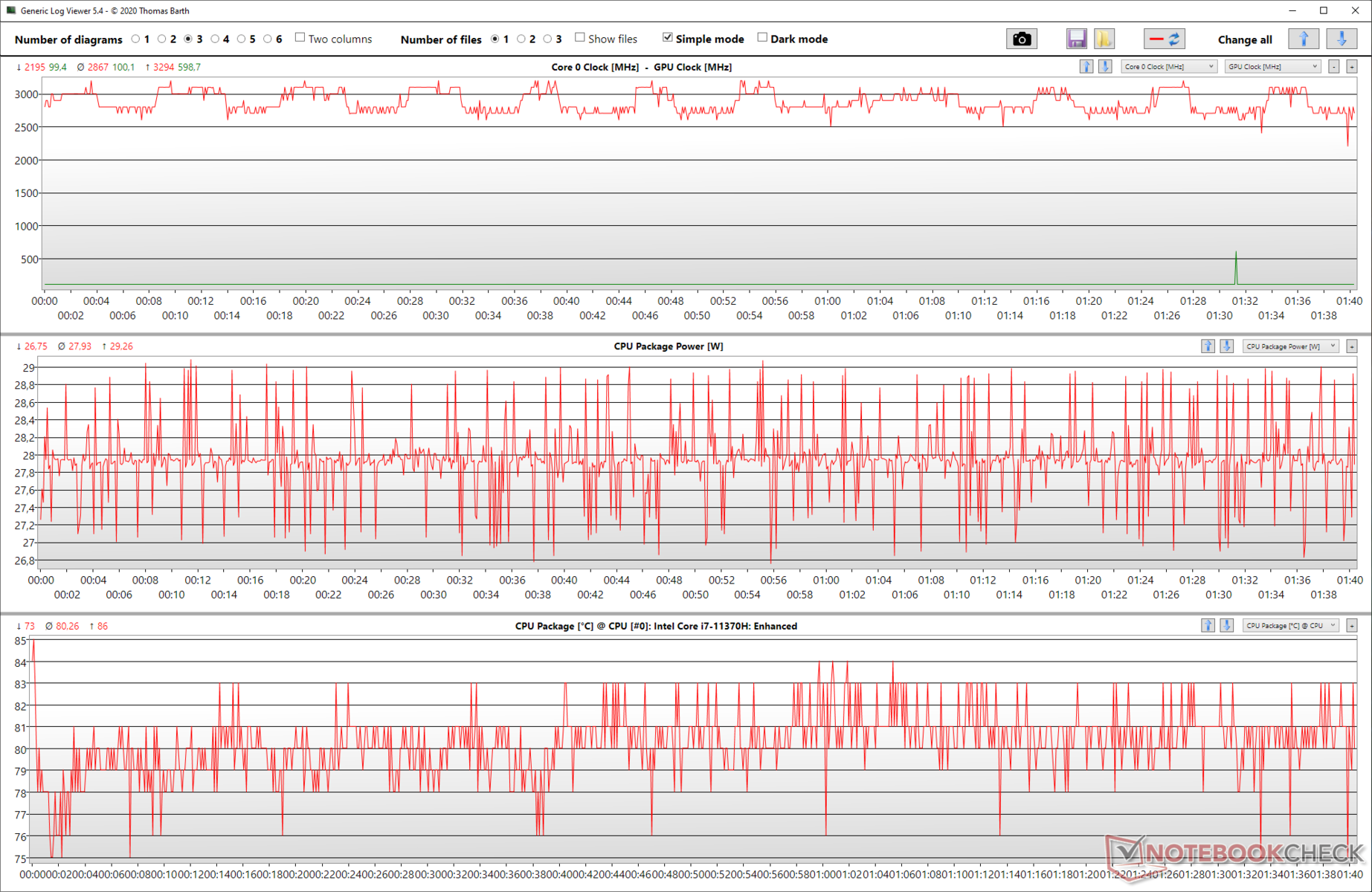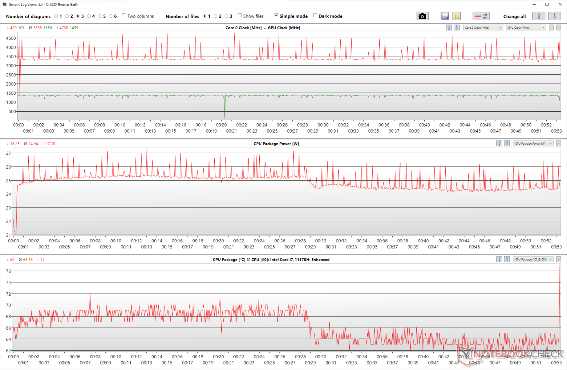 Unter The Witcher 3 (1080p Ultra) erreicht der Core i7-11370H ab und zu die 4,5-GHz-Marke, während die GPU recht stabil bei 1,35 GHz taktet. Im späteren Testverlauf gibt es leichte Einbrüche der Package Power auf 25 W.
