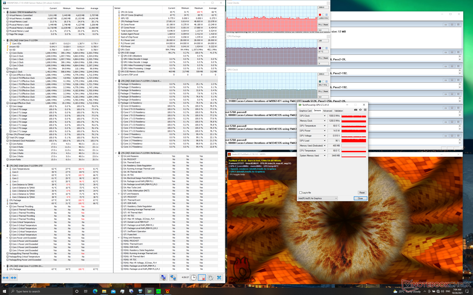 Wird dann noch FurMark als Last hinzugefügt, verkleinert sich der Spielraum der CPU weiter, da sie die Energie nun mit der iGPU teilen muss. In Folge dessen fällt die CPU-Taktrate auf nur noch 1,6 GHz, während die iGPU auf etwa 1 GHz boosten darf. Die Package Power steigt auf 30 W, um den Bedarf der iGPU zu decken, die Package-Temperaturen schwanken zwischen 70 °C und 75 °C.