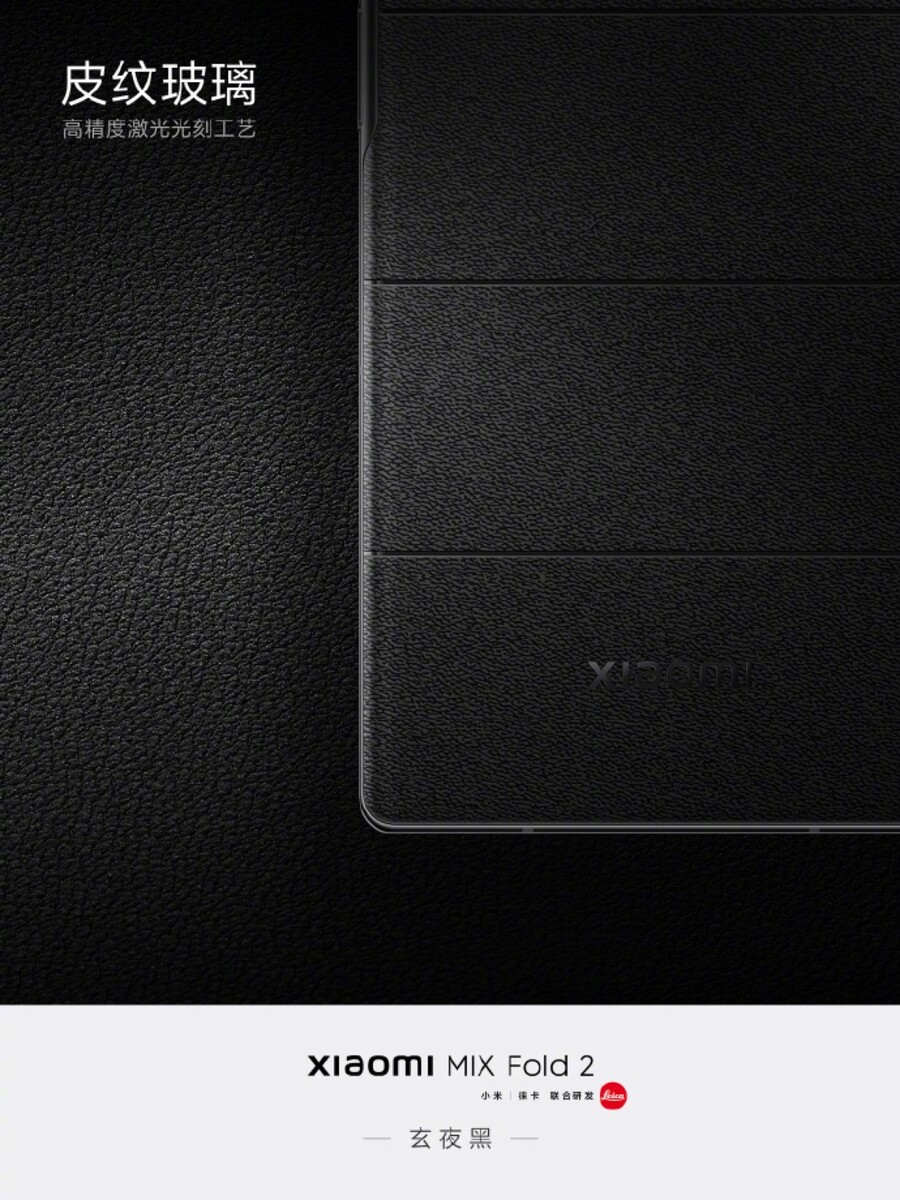 Die Version in der Farbe "Black Night" besitzt eine Rückseite aus Glas, die allerdings so verarbeitet wird, dass sie eine Leder-Textur erhält – der Effekt sieht zumindest auf den Marketing-Bildern überzeugend aus. Auch bei diesem Modell wird der Bereich rund um das Kameramodul durch eine glänzende Oberfläche hervorgehoben, anders als beim regulären Xiaomi Mix Fold 2.