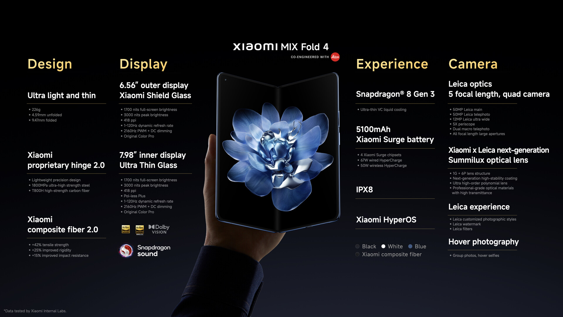 Xiaomi verbaut eine Leica Summilux gebrandete Quad-Cam mit zwei macro-fähigen Telefotos, eines mit 50 MP Sensor und 2x Zoom bei F/2.0 Blende und eines mit 10 MP Sensor bei 5x Zoom und F/2.9 Blende. Die Hauptkamera ist ein 50 Megapixel Light Hunter 800 Sensor (wohl auf Omnivision Basis) mit F/1.7 Blende und 23mm Brennweite sowie OIS. Dazu gibt es ein 12 Megapixel Ultraweitwinkel mit F/2.2 Blende. Neben dem dynamischen 7,98 Zoll Flex-Display an der Innenseite mit 2.488x 2.224 Pixeln und 3.000 nits maximaler Helligkeit gibt es an der Außenseite ein gleich helles, dynamisches 6,56 Zoll OLED mit 2.520 x 1.080 Pixel Auflösung.