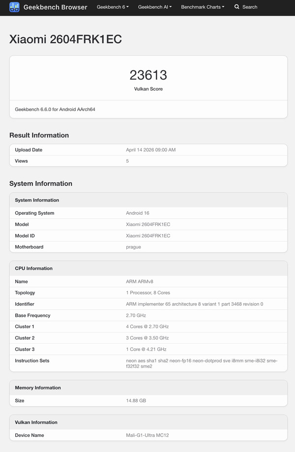 Bei der CPU-Leistung bewegt sich das Gerät unterdessen auf dem Niveau, das inzwischen vom MediaTek Dimensity 9500 und seinem Octa-Core-Chipsatz zu erwarten ist. Damit liefert sich das Redmi K90 Max ein Duell auf Augenhöhe mit aktuellen Flaggschiffen wie dem Samsung Galaxy S26 Ultra, dem Xiaomi 17 Ultra und dem OnePlus 15 (ab 882 Euro bei Amazon bestellbar). Geekbench deutet außerdem darauf hin, dass Xiaomi das Redmi K90 Max mit bis zu 16GB Arbeitsspeicher anbieten wird.