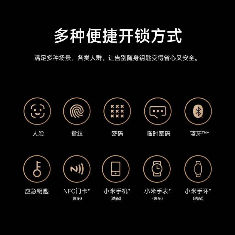Xiaomi bietet allerdings noch zahlreiche, weitere Entsperroptionen an. So ist die Nutzung des Fingerabdrucks ebenso möglich wie von Passwörtern. Dabei kann ein Passwort sowohl dauerhaft als auch nur temporär möglich sein beziehungsweise zyklisch gewechselt werden. Die Entsperrung soll über Bluetooth mit einer entsprechenden App ebenso möglich sein wie über NFC, die Nutzung eines Schlüssels für den Notfall ist ebenso möglich.