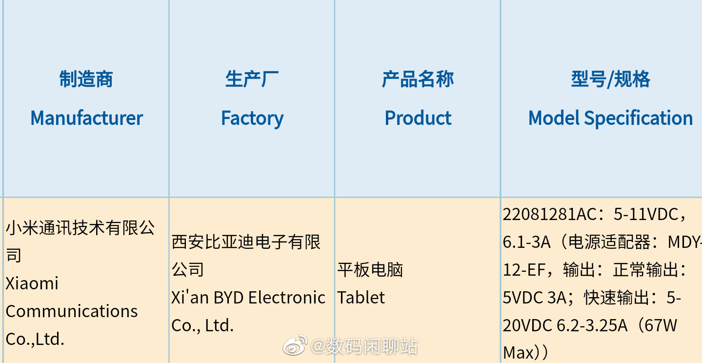 Eines der vier Modelle hat der bekannte Leaker Digital Chat Station nun bei der chinesischen Zertifizierungsstelle 3C entdeckt, wie er auf Weibo berichtet. Aus dem dortigen Eintrag geht eine Ladegeschwindigkeit von bis zu 67 Watt hervor. Gelistet ist der Eintrag unter der Modellnummer 22081281AC, also kurz L81A. Anhand des angehängten "C" ist zu erkennen, dass es sich hierbei um die China-Version des Tablets handelt.
