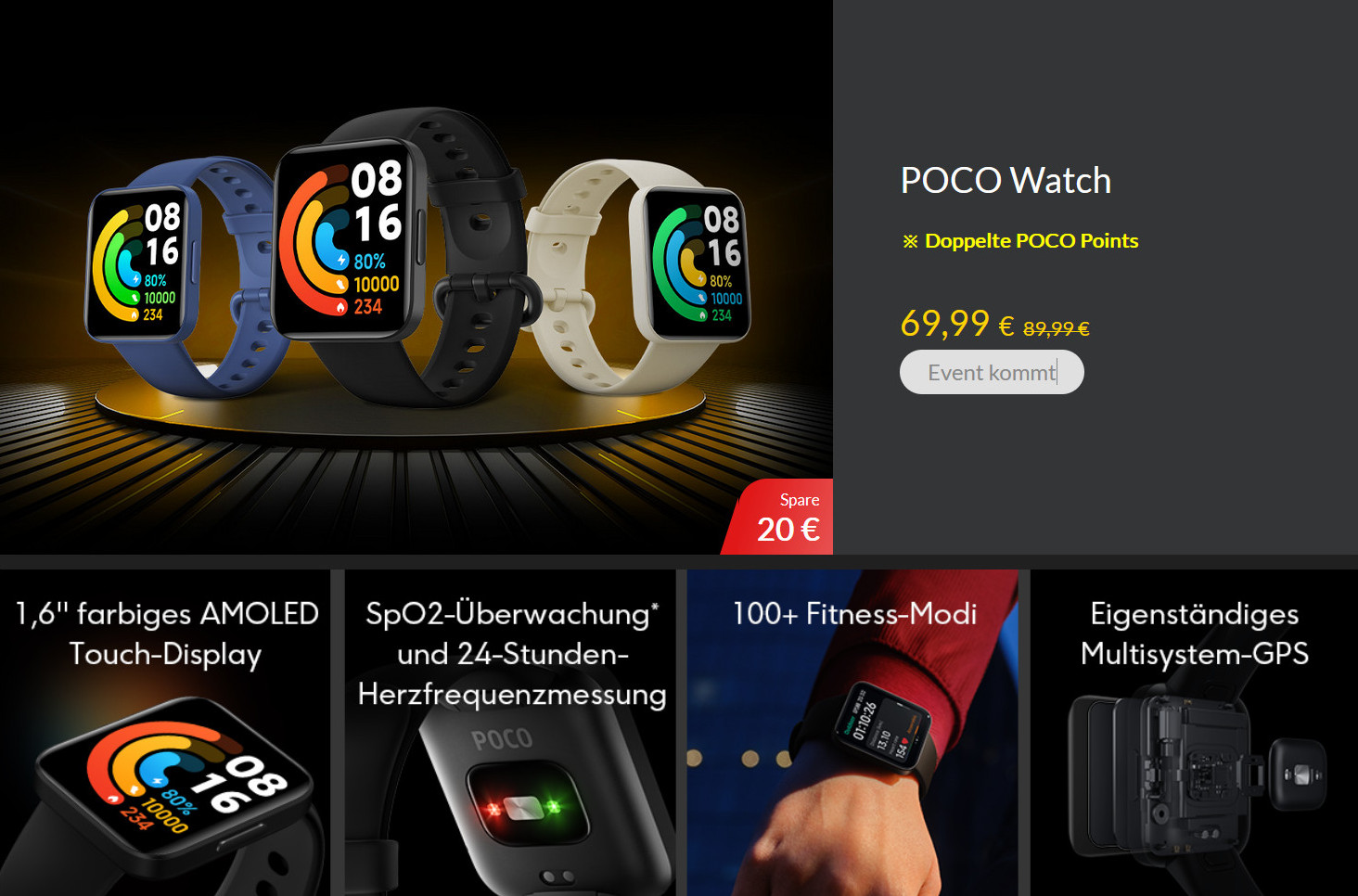 Das 1,6 Zoll große AMOLED-Touchdisplay der Poco Watch bietet eine Auflösung von 360 x 320 Pixeln, als Sensoren hat die Poco Watch einen optischen Herzfrequenzsensor, Beschleunigungsmesser, Gyroskop, elektronischen Kompass, GPS und Bluetooth 5.0 BLE an Bord. Als Funktionen stehen auf der Poco Watch neben 24-Stunden-Herzfrequenzmessung auch SpO2-und Schlaf-Tracking, Atemübungen, Stresspegelüberwachung, Periodenrechner für Frauen, Always-on-Watchfaces sowie 100 Trainingsmodi zur Verfügung. Abgerundet wird die Ausstattung der Poco Watch von einer Akkulaufzeit von bis zu 14 Tagen.