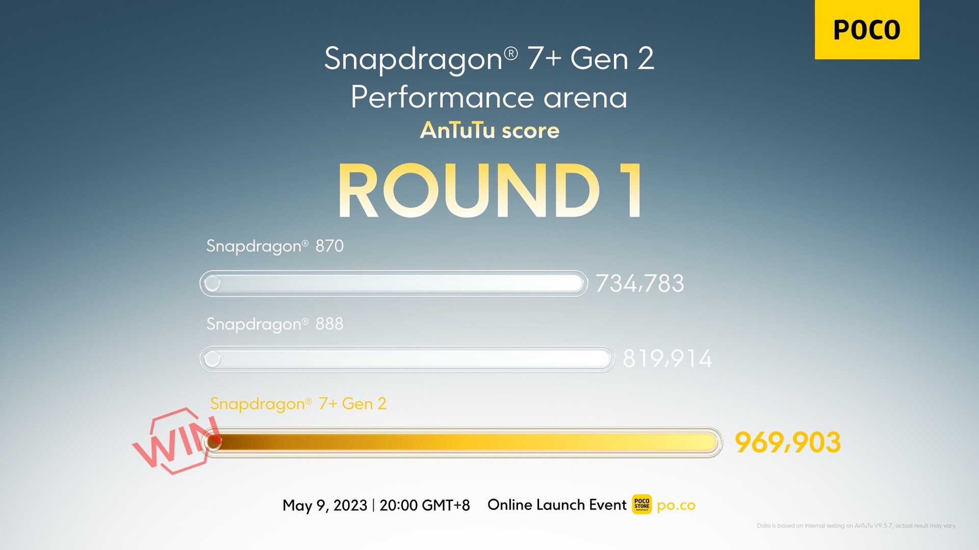 Beim Poco F5 konzentriert sich Xiaomi vor allem darauf, die Vorzüge des brandneuen Qualcomm Snapdragon 7+ Gen 2 zu bewerben. Kaum überraschend, denn der Chip besitzt einen ARM Cortex-X2 Performance-Kern mit Taktraten bis 2,91 GHz, drei Cortex-A710 Kerne bei 2,49 GHz und vier sparsame Cortex-A510 Effizienz-Kernen bei 1,8 GHz. Mit dieser Ausstattung erreicht der das Poco F5 laut Xiaomi rund 969.000 Punkte bei AnTuTu, und übertrifft Flaggschiffe mit Qualcomm Snapdragon 888 mühelos, trotz weitaus geringerem Stromverbrauch.