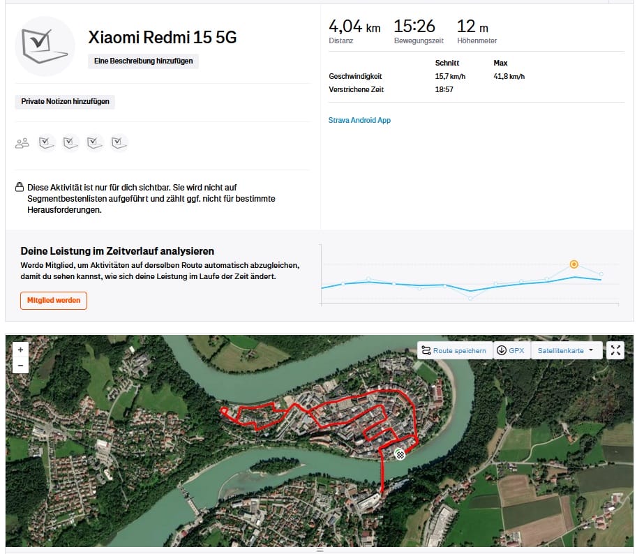 Auch das Redmi 15 5G macht im offeneren Gelände seine Sache nicht schlecht: Ein- oder zweimal fahren wir zwar scheinbar durch Vorgärten, aber es handelt sich hierbei nur um wenige Meter Abweichung von der tatsächlich gefahrenen Strecke.