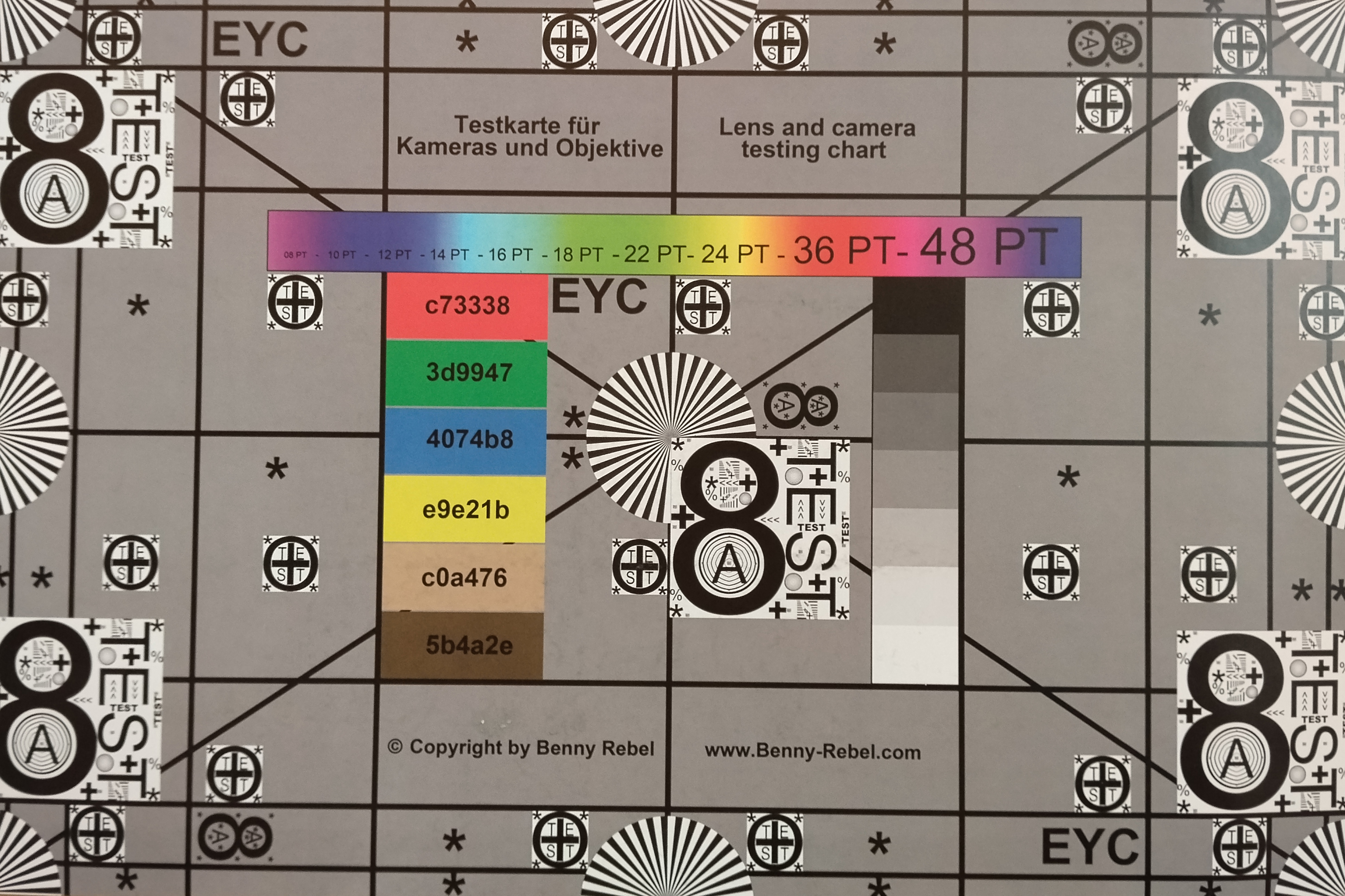 Hauptkamera PflanzeHauptkamera UmgebungHauptkamera Low LightAuch bei Studiolicht sind die Ergebnisse eher durchwachsen: Das Testchart wirkt teils fleckig und der Kontrast bei Text vor rotem Hintergrund bricht ein. Im Detail ist die Schärfe eher mäßig.