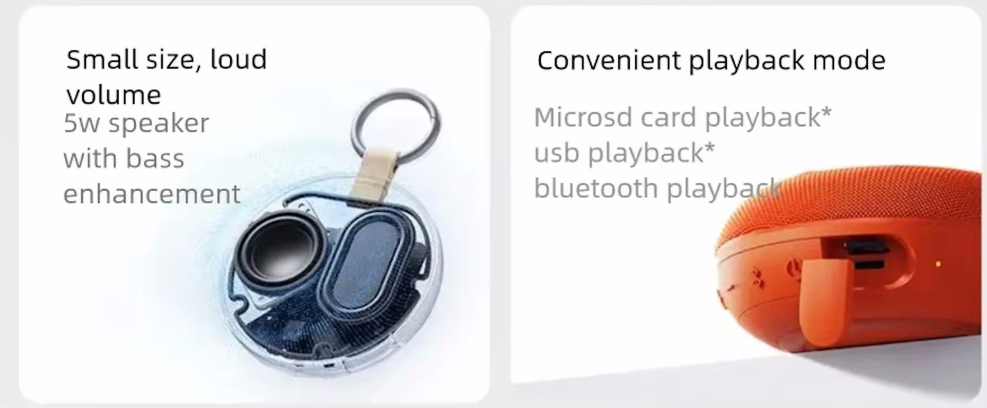 Es handelt sich um wirklich sehr kompakte Bluetooth-Lautsprecher. Mit einer Größe von 9,8 x 4,6 x 14,6 Zentimeter lässt sich der Lautsprecher auch dank der Schlaufe etwa an einem Rucksack einfach mitnehmen, angegeben wird ein Gewicht von 200 Gramm. Die Leistung ist dementsprechend aber beschränkt und wird mit 5 Watt angegeben. Ebenfalls beschränkt ist die Akkukapazität, so soll diese bei nur 1.000 mAh liegen - bei der Nutzung mit 80 Prozent Lautstärke ergibt sich Herstellerangaben zufolge aber immerhin eine Laufzeit von bis zu 5 Stunden. Zwei der Lautsprecher lassen sich für die Wiedergabe von Stereo-Sound koppeln.