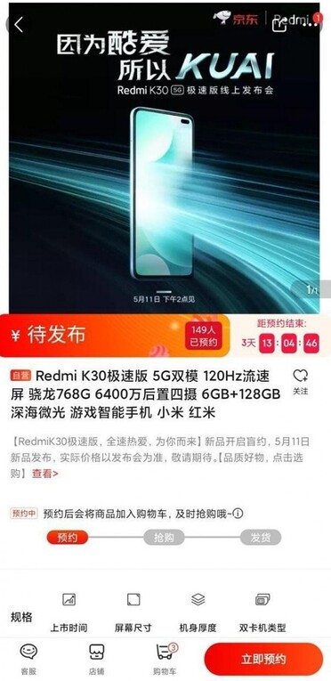 Beim chinesischen Händler JD.com ist das neue Redmi K30 5G mit dem Beinamen "Speed Edition" beziehungsweise "Extreme Edition" ebenfalls bereits aufgetaucht und wurde dort anfangs ganz offen mit einem noch nicht veröffentlichten Qualcomm-Chipsatz namens Snapdragon 768 angeteasert. Die Webseite hat JingDong zwar mittlerweile geändert, es gibt allerdings einige Screenshots im Netz, die den möglichen Leak beweisen. (siehe unten).