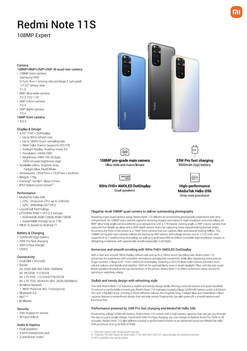 Die 50-MP-Quadkamera des Redmi Note 11 besteht aus 50-MP-Hauptsensor (f/1.8), 8-MP-Ultraweitwinkel (f/2.2, 118°), 2-MP-Makro (f/2.4) und Tiefensensor (f/2.4). Vorne baut Redmi dem Dual-SIM Note 11 eine 13-MP-Selfiecam (f/2.4) unters Display. Der 5.000-mAh-Akku unterstützt 33-Watt-Schnellladen über USB-C, ein passender 33-Watt-Charger gehört zum Redmi Note-1-Lieferumfang dazu. Ein seitlich integrierter Fingerabdrucksensor, WiFi 802.11ac, Bluetooth 5.0, NFC (modellabhängig), eine integrierte 3,5-mm-Soundbuchse runden die Ausstattung des Redmi Note 11 ab. Als Android-OS läuft auf dem Note 11 das Android 11 basierte MIUI 13.
