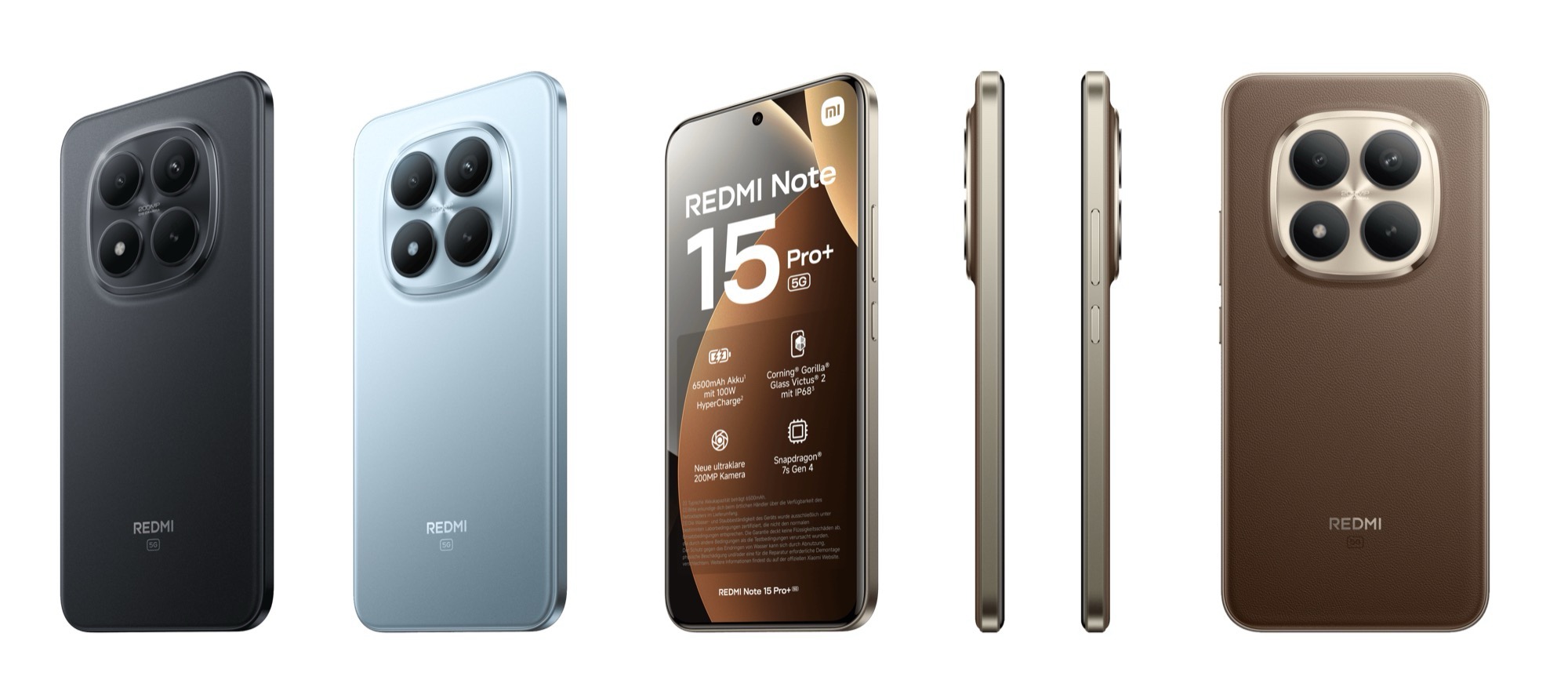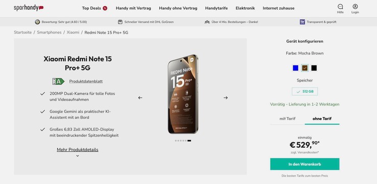 Nachdem am Dienstag bereits Details zur Ausstattung des europäischen Redmi Note 15 Pro+ geleakt sind, wird das Redmi Note 15 Pro+ bei Sparhandy bereits verkauft. Das Smartphone wird mit 12 GB Arbeitsspeicher und 512 GB Flash-Speicher für 529,99 Euro angeboten, wahlweise in Braun, Blau oder Schwarz. Später soll auch eine günstigere Version mit 256 GB Speicher angeboten werden.