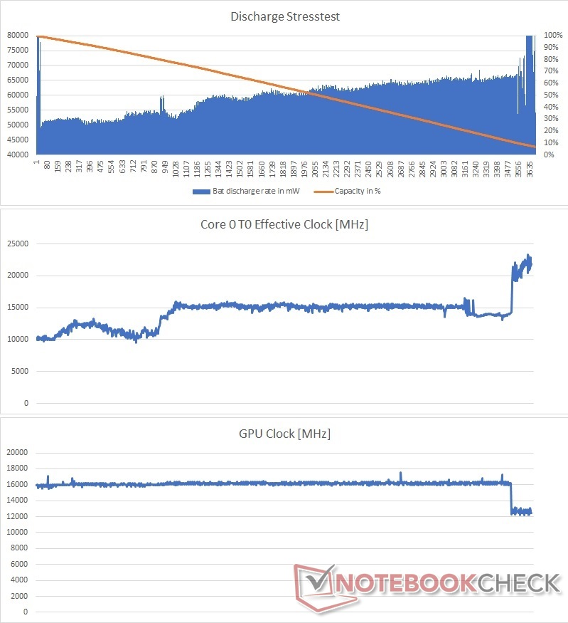 Der Akku im RedmiBook Pro 15 hat eine Kapazität von 70 Wh. Damit liegen die ermittelten Werte für die Akkulaufzeit etwas unter den Erwartungen. Die von CPU und GPU im Akkubetrieb abrufbaren Leistungen sind nahezu über den gesamten Entladetest unter Volllast konstant. Auffällig ist, dass bei Unterschreiten von 15 % Akkukapazität plötzlich deutlich mehr Energie aus dem Akku bezogen wird und sich auch die Taktraten von CPU und GPU verändern. Die Werte für der Entladekurve rechts stammen aus einem Log von HWiNFO. Der leichte Anstieg der entnommenen Energie über den gesamten Entladevorgang dürfte dagegen vom Wirkungsgrad der Spannungswandler abhängen und ließe sich dementsprechend nur schwer beheben.