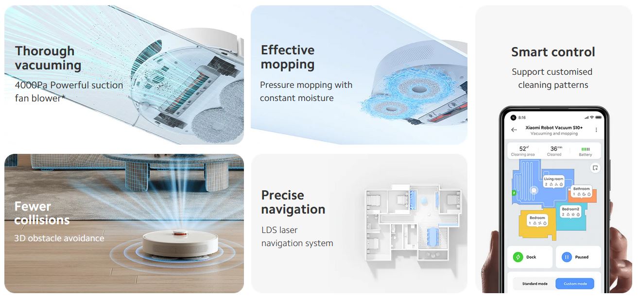 Zu dem Schwung neuer Saug- und Wischroboter, die Xiaomi kürzlich auf seiner globalen Webseite vorgestellt hat, zählt auch der Xiaomi Robot Vacuum S10+. Es handelt sich hierbei um eine besser ausgestattete Variante des ebenfalls neuen Xiaomi Robot Vacuum S10, der sich zu den weiteren Neuheiten des günstigen Xiaomi Robot Vacuum E10 und des erschwinglichen Flaggschiff-Modells Xiaomi Robot Vacuum X10 gesellt.