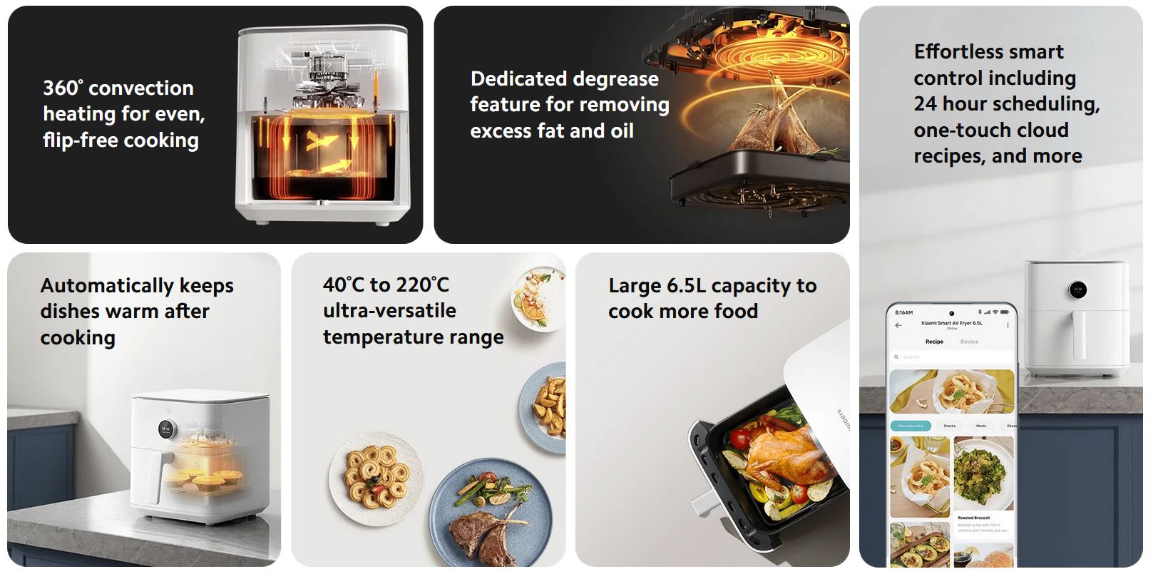 Im Inneren verbaut Xiaomi eine 360-Grad-Konvektionsheizung für ein gleichmäßiges Garen ohne Umdrehen. Eingestellt werden können Temperaturen zwischen 40 und 220 °C. Die spezielle Entfettungsfunktion beseitigt laut Hersteller überschüssiges Fett und Öl und sorgt so für eine möglichst gesunde Zubereitung.