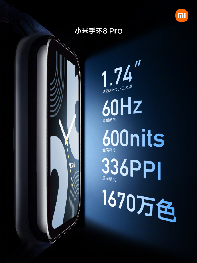 Im Vergleich zur vorherigen Generation wächst das Display des Xiaomi Smart Band 8 Pro von 1,64 auf 1,74 Zoll an und nimmt 73 Prozent der Geräteoberseite ein. Es ist das bisher grö0te Display in einem Fitness-Armband von Xiaomi. Das AMOLED-Panel weist eine hohe Pixeldichte von 336 PPI auf, leuchtet bis zu 600 Nits hell und aktualisiert mit 60 Hz. Auf der Unterseite kommt ein neuer Dual-Channel-Sensor für die üblichen Gesundheitsfeatures wie Puls- und SpO2-Überwachung zum Einsatz. Dazu runden GNSS, NFC, über 150 Sportmodi sowie zahlreiche weitere Apps die Ausstattung des 9,9 mm dünnen, 22,5 g leichten und bis 5 ATM wasserdichten Xiaomi Smart Band 8 Pro ab.