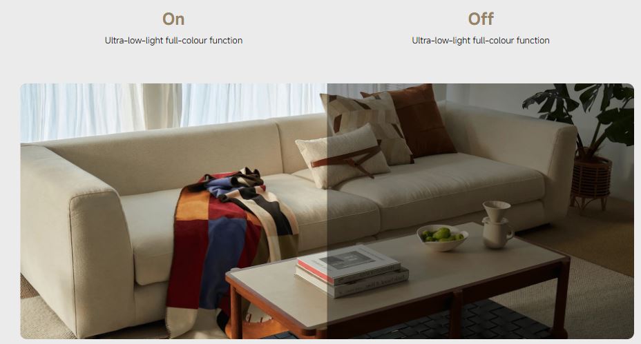 Verbaut sind Mikrofon und Lautsprecher, womit sich mit vor der Kamera befindlichen Personen kommunizieren lässt, dabei wird auch etwa eine Reduktion des Echos versprochen. Die Integration in das Smart Home ist möglich, beworben werden auch spezielle Funktionen wie die Erkennung von Personen, aber auch etwa das Alarmieren beim Verlassen eines optisch definierten Bereichs. Die mit 940 Nm arbeitenden IR-LEDs sollen mit dem bloßen Auge auch nicht als Glimmen wahrnehmbar sein, auch bei geringer Helligkeit lassen sich Herstellerangaben zufolge noch farbige Bilder erstellen.