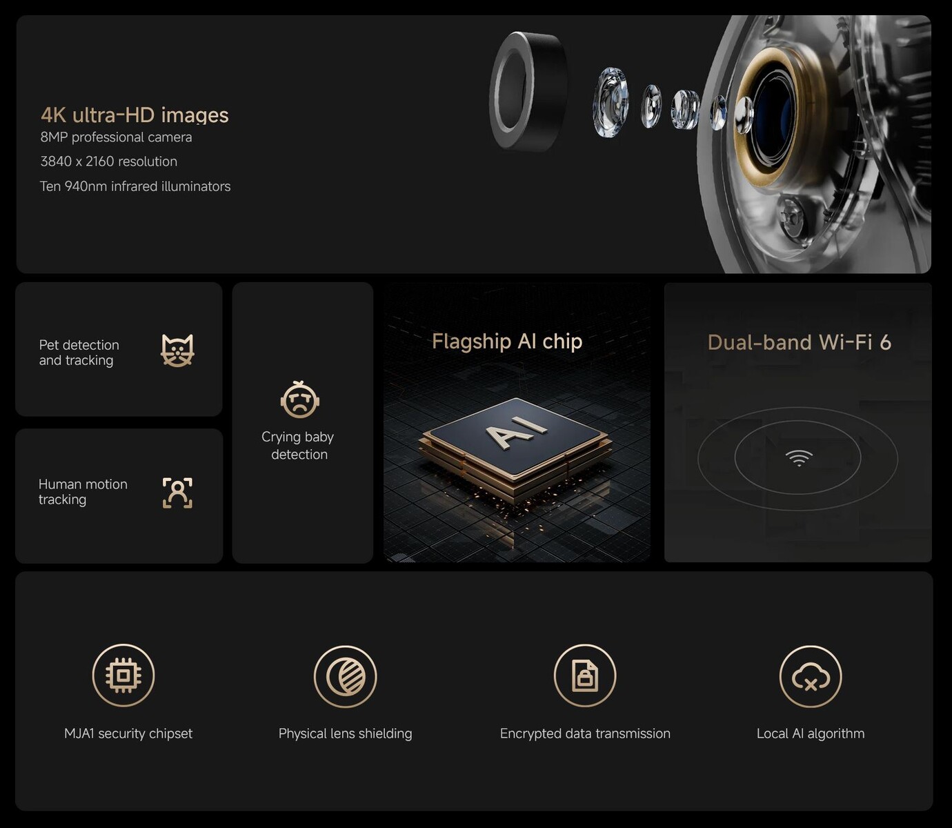 Neben Zwei-Wege-Audio und Wi-Fi 6 unterstützt sie lokale Speicherung auf einer bis zu 256 GB großen microSD-Speicherkarte oder einem NAS. Außerdem hat die Xiaomi Smart Camera C700 diverse lokale KI-Features an Bord, darunter die Erkennung von Babygeschrei oder lauten Geräuschen.