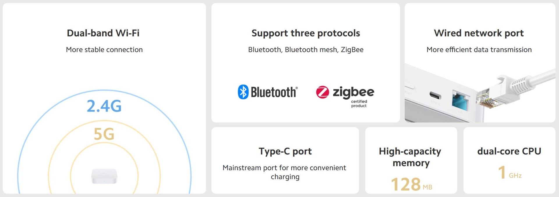 Der Xiaomi Smart Home Hub 2 ist eine klassische Zentrale für die Steuerung eines smarten Zuhauses. Der weiße und quadratische Kasten vereint mehrere Funkstandards, um möglichst viele Sensoren, Aktoren und andere Geräte miteinander vernetzen zu können. Im Einsatz sind hierbei Dual-Band-Wi-Fi bei 2,4 und 5 GHz, Bluetooth und Bluetooth Mesh sowie Zigbee. Damit unterstützt die Smart-Home-Zentrale drei gängige Funkstandards, verzichtet allerdings auf andere wie Z-Wave und Matter.