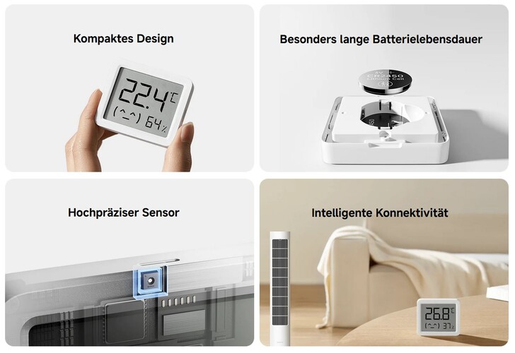 Die Werte lassen sich nicht nur am Gerät ablesen, sondern auch über die Xiaomi Home App abrufen und im Smart Home verwenden. Eine Kopplung mit einem Bluetooth-Mesh-Gateway ist möglich, um beispielsweise einen Ventilator automatisch bei hoher Temperatur oder einen Luftbefeuchter bei geringer Luftfeuchtigkeit einzuschalten. Xiaomi verspricht hierbei nicht nur genaue Messwerte dank eines präzisen Sensors, sondern auch eine lange Batterielebensdauer (CR2450) von bis zu drei Jahren.