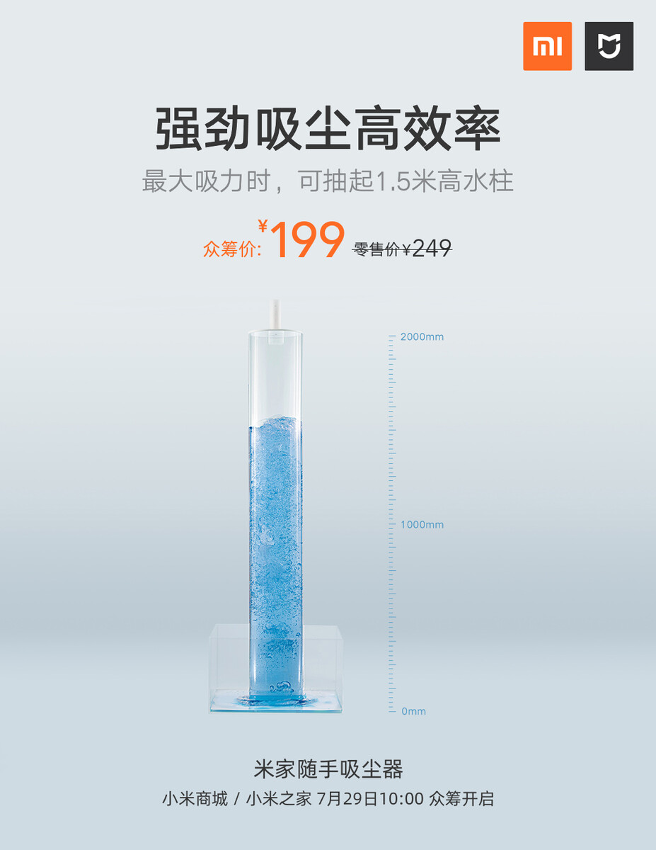 Leichter als eine 0,5-Liter-Wasserflasche und ganz schön kräftig: Xiaomi hat heute für seine Crowdfunding-Plattform einen kleinen Mijia Akku-Handstaubsauger in der Größe einer 500-ml-Flasche angekündigt, der ab dem 19. Juli um 10 Uhr Peking-Zeit zu einem Preis von 199 Yuan (25 Euro) zu haben sein wird.