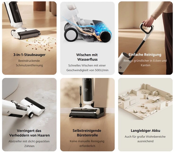 Der neue Xiaomi Truclean W20 Wet Dry Vacuum ist ein Nass-Trockensauger oder auch 3-in-1-Staubsauger. Das Gerät kann in einem Arbeitsgang saugen und feucht durchwischen. Hierfür ist der Wischsauger auf der Unterseite mit einer Bürstenrolle ausgestattet, die mit einer Geschwindigkeit von 500 Umdrehungen pro Minuten dreht und somit aktiv den Boden schrubbt. Dank Echtzeit-Selbstreinigungssystem wird die Bürste immer mit fließendem und sauberem Wasser versehen und anschließend von Schmutz befreit. Die dicht gepackten Zähne des Abstreifers sollen hierbei auch Haare am Verheddern hindern.