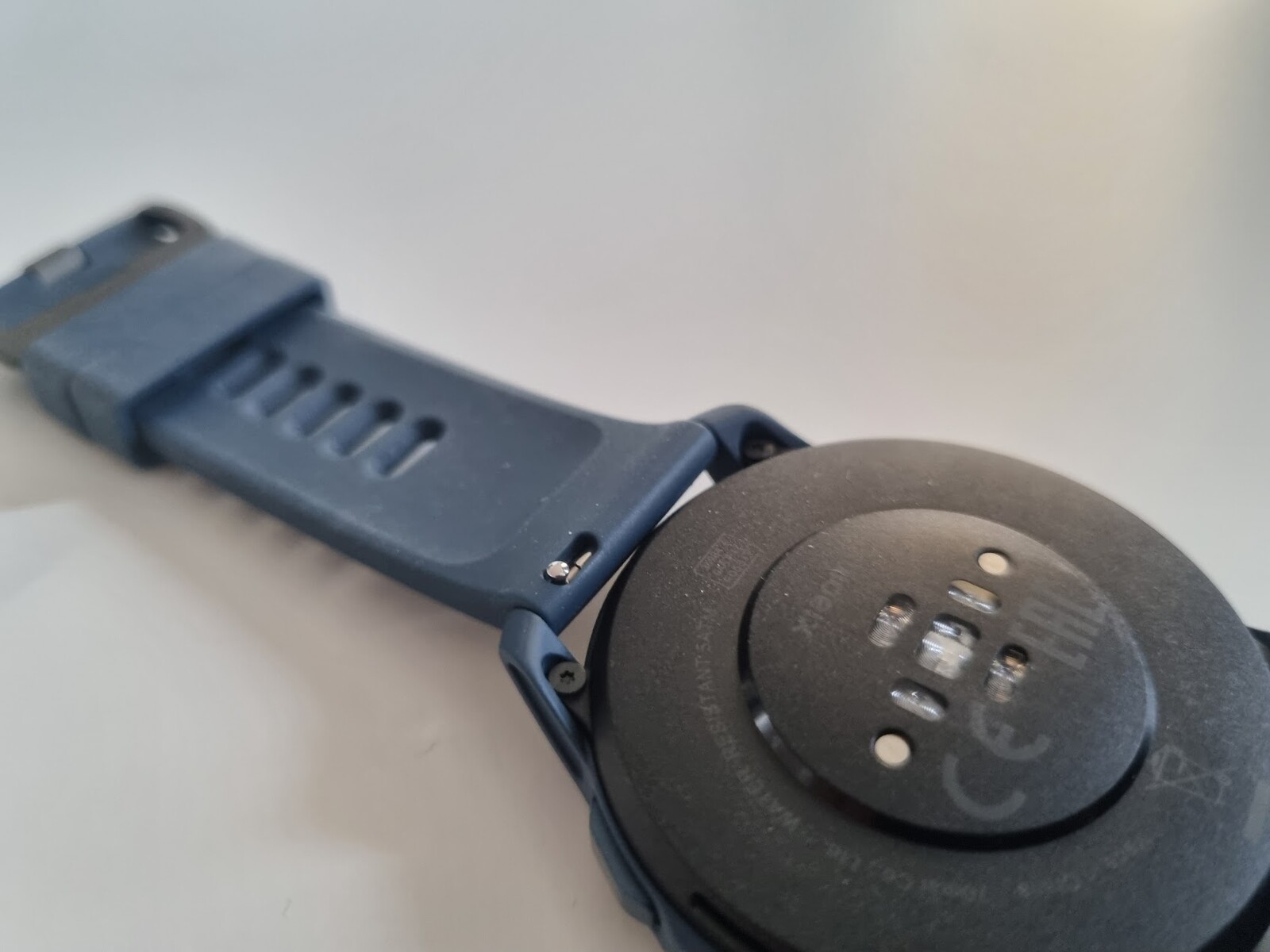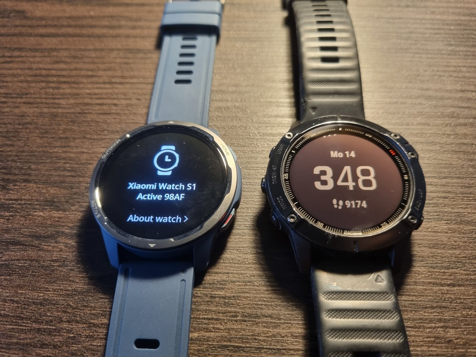 Die Xiaomi Watch S1 Active bringt inklusive Armband 53 Gramm auf die Waage und ist damit im Vergleich zur täglich getragenen Fenix 6 Pro mit ihren 83 Gramm durchaus ein Leichtgewicht. Das Kunststoff-Gehäuse ist an der Front mit einer nicht drehbaren, offenbar auf Metall angefertigten Lünette verstärkt. An der rechten Gehäuseseite sind zwei aus Metall gefertigte Knöpfe zu finden. Auf der Rückseite befindet sich das optische Sensormodul, wobei anscheinend vier Photosensoren verbaut sind, eine Trageerkennung ist vorhanden. Das Wearable ist an der dicksten Stelle 4,7 Zentimeter breit und 1,2 Zentimeter dick, der Bildschirm misst 4 Zentimeter. Es wird ein handelsübliches 22-Millimeter-Armband genutzt. Aufgeladen wird das Wearable über eine magnetische Ladestation.