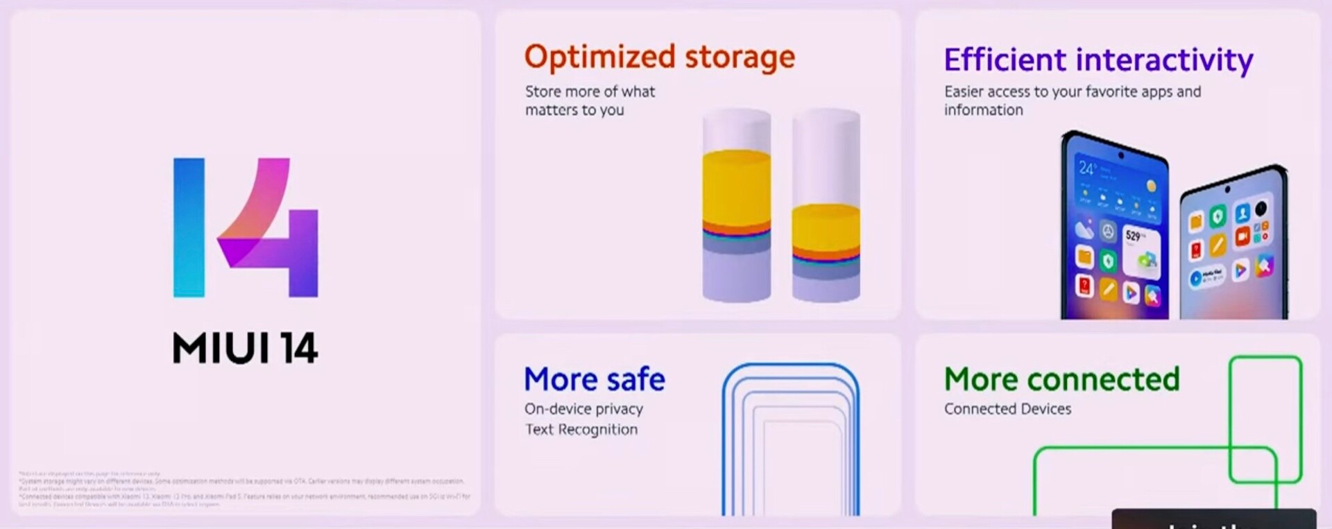 Größere Ordner und neue Widgets bereichern den Homescreen, während die Privatsphäre zusätzlich geschützt werden soll, indem die Texterkennung direkt auf dem Gerät erfolgt, statt auf Xiaomis Servern. Einige der interessantesten Features der chinesischen MIUI 14 Version fehlen der finalen Software in Europa offenbar wieder einmal, denn von den virtuellen Haustieren, dem bis zu 22 Prozent niedrigerem Stromverbrauch und der neuen Smart-Home-App fehlt in der Präsentation jede Spur.