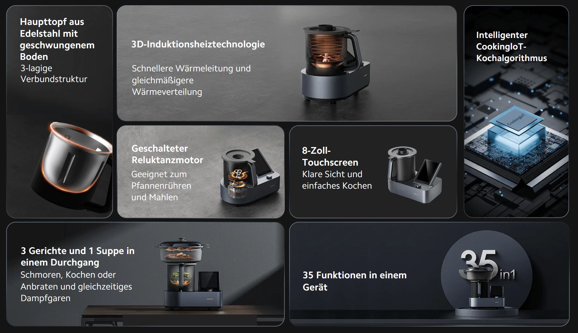 In dem Haupttopf aus Edelstahl ist 3D-Induktionsheiztechnologie verbaut. Zudem kann der integrierte Motor zum Pfannenrühren und Mahlen verwendet werden. Hierfür lassen sich verschiedene Geschwindigkeiten von 40 Umdrehungen pro Minute zum Umrühren bis hin zu 12.000 Umdrehungen pro Minute zum Zermahlen einstellen.