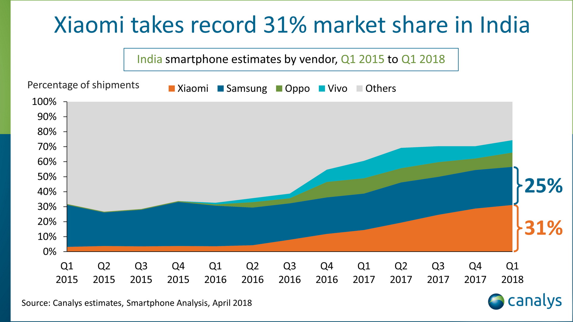 Das gilt zum Beispiel auch für den großen Smartphone-Markt in Indien. Dort ist der chinesische Hersteller Xiaomi, dank einer enormen Präsenz auf Onlinekanälen und im stationären Handel, extrem populär. Das liegt sicher auch an einer sehr breiten Preis- und Produkt-Range, mit der Xiaomi in Indien sehr viele Menschen ansprechen kann. Die Analysten von Canalys haben sich den Erfolg von Xiaomi in Indien genauer angesehen und festgestellt, dass Xiaomi seine Marktposition in Indien im ersten Quartal 2018 erneut weiter ausbauen konnte. Xiaomi holte sich im ersten Quartal 2018 in Indien einen Marktanteil von 31 Prozent und schaffte es damit erneut, den Abstand zu Samsung als Nummer 2 auf dem indischen Smartphone-Markt zu vergrößern. Außerdem steigerte Xiaomi in Indien sein Absatzvolumen in Q1/2018 im Vergleich zum Vorjahreszeitraum gleich um satte 155 Prozent auf über 9 Millionen abgesetzte Geräte.