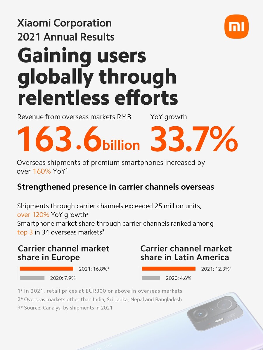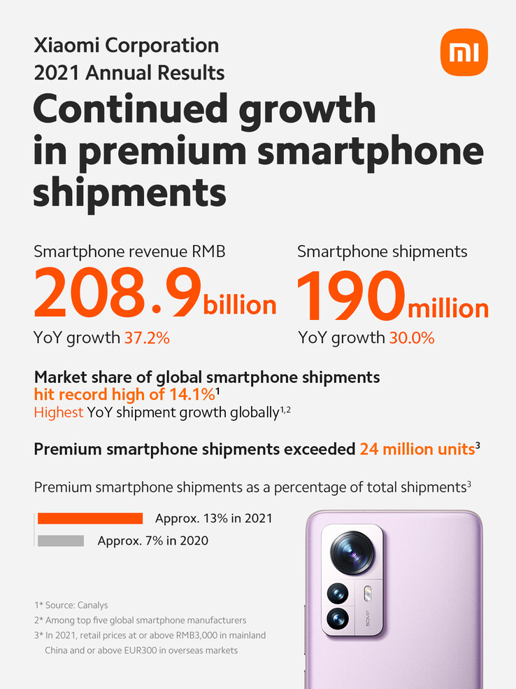 Laut der Angaben von Xiaomi konnte das Unternehmen weltweit einen Marktanteil von 14,1 Prozent für sich beanspruchen. 13 Prozent oder rund 21 Millionen Smartphones entfallen auf das Premium-Segment, wobei Xiaomi "Premium" so definiert, dass alle Geräte mit einem Listenpreis ab 300 Euro in diesen Bereich fallen. Ob dieses eindrucksvolle Wachstum beibehalten werden kann bleibt abzuwarten, denn das Xiaomi 12 (ca. 850 Euro auf Amazon) verkauft sich laut ersten Berichten kaum halb so gut wie das Xiaomi Mi 11 im Vorjahr.